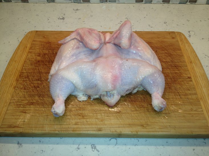 2. Butterfly chicken by splitting the breast cavity with sharp knife.