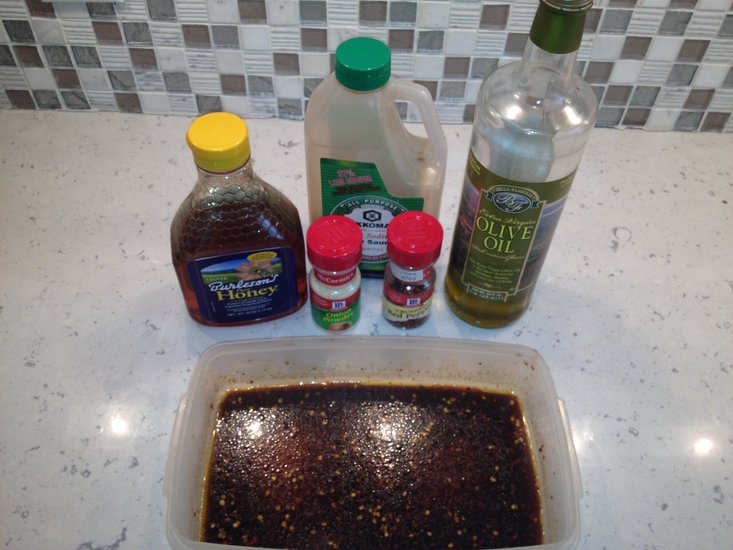 1. Combine honey, soy sauce, crushed red pepper, a pinch of salt, onion powder, and olive oil.