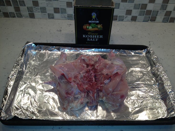 1. Place chicken on aluminum foil covered shallow baking sheet, add salt, and set aside.